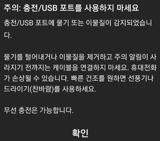 비 오는 날 휴대폰을 물에 떨어뜨리고 잽싸게 주웠지만, 갤럭시 물기 감지 알림이 떴습니다.(왼쪽 사진)